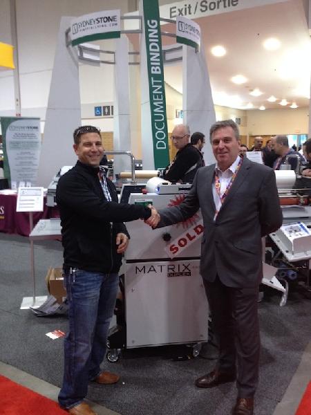 Over at booth 1000 Sydney Stone sold a Vivid Laminating Matrix 530DP laminator to John Olinsky of OJ Graphix Inc. The Matrix allows printers to laminate single side, double side and encapsulate work in-house.